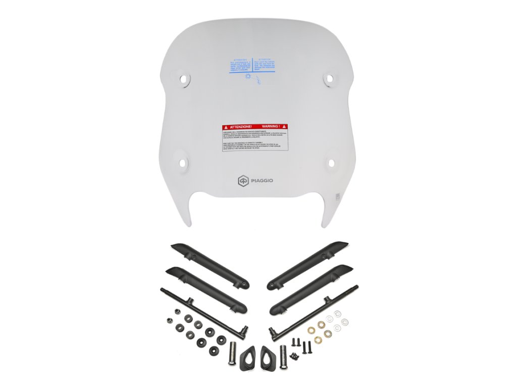 Sada držáku a plexi z nárazuvzdorného polymethylmethakrylátu (PMMA). Tloušťka 4 mm, výška 408 x šířka 399 mm, průhledná barva. Testováno a schváleno výzkumným a vývojovým centrem Piaggio.