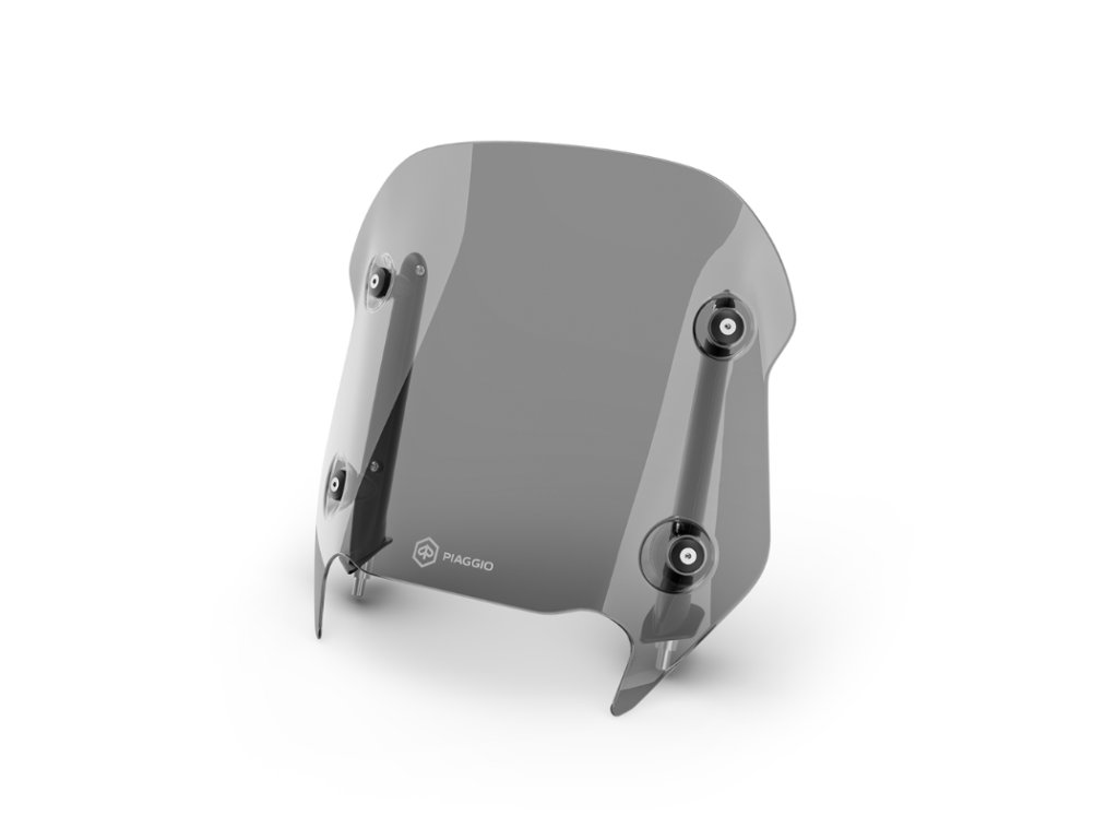 Sada držáku + plexi z nárazuvzdorného polymethylmethakrylátu (PMMA). Tloušťka 4 mm, výška 408 x šířka 399 mm, průhledná barva. Testováno a schváleno výzkumným a vývojovým centrem Piaggio.