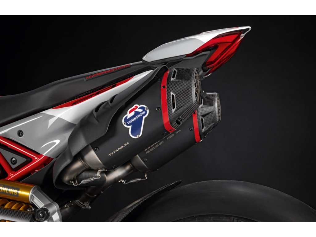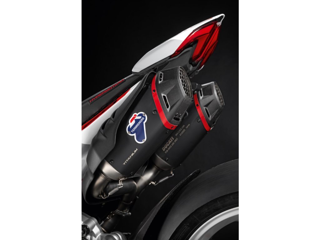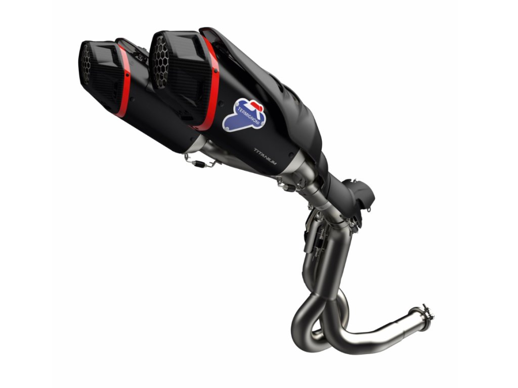 Z technických znalostí společnosti Termignoni vzešel tento kompletní výfukový systém s černou titanovou vložkou. Tento lehký systém – s exkluzivním designem – byl vyvinut pro zajištění maximálního výkonu na trati. Perfektní doplněk s výrazným zvukem, který vyrazí na trať a uvolní plný závodní charakter vaší Ducati.