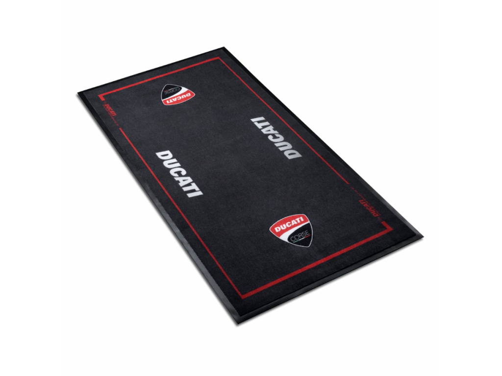 Exkluzivní rohož, ideální do dílen, garáží a závodních boxů, v nezaměnitelném klasickém barevném schématu Ducati Corse. Vrchní vrstva, vyrobená ze 100% polyamidové plsti, je mimořádně kompaktní a odolná a absorbuje a zadržuje veškeré rozlité tekutiny. Spodní vrstva, vyrobená z voděodolné PVC gumy, je také opatřena proti zakopnutí pro zajištění maximální bezpečnosti. Pečlivý výběr a kombinace těchto materiálů odolných vůči oleji a palivu je činí odolnými a vysoce kvalitními, ideálními pro parkování motocyklu v garáži nebo na parkovišti. Digitálně potištěná grafika zůstává v jedné rovině s povrchem rohože a nemění savost a měkkost materiálu. Perfektní doplněk, který dodá vaší garáži nebo parkovišti extra profesionální vzhled, který nezůstane bez povšimnutí. Splňuje normy FIM ENVIRONMENTAL 4.1 a FMI: Art.47.