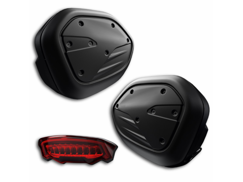 Styl, velká kapacita, odolnost: to jsou silné stránky nových polotuhých bočních brašen. Jejich rozšiřitelná kapacita vám umožní přepravovat vše, co na cestu potřebujete. Dodává se nové zadní světlo, které nahrazuje originální verzi, aby se obnovila typová homologace motocyklu a byla zajištěna viditelnost a bezpečnost. Sada obsahuje také vodotěsné kryty, takže vás nezastihne déšť. Design a styl z nich dělá perfektní doplněk k elegantním liniím motocyklu. Perfektní doplněk pro plné vychutnání každého dobrodružství.